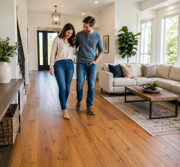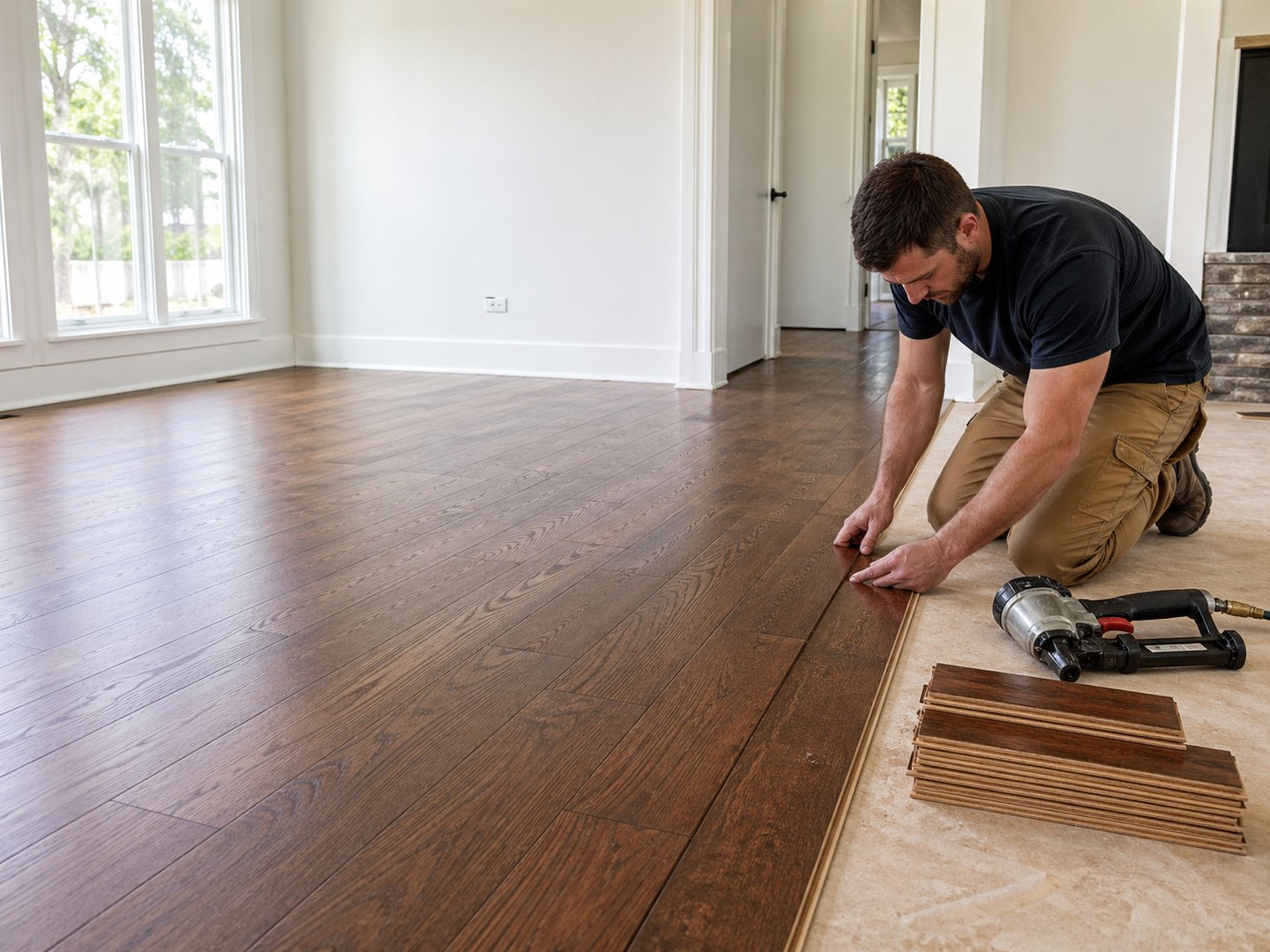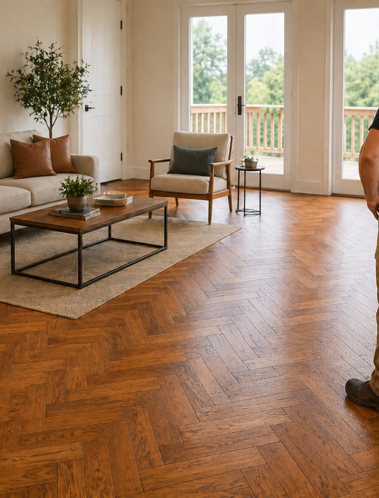 Professional hardwood floor installation with attention to layout, cuts, transitions, and finish details.